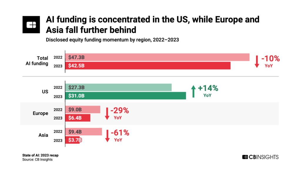 根据CB Insights的统计数据。2023年,美国AI领域初创公司的投融资数量达1151个,总融资额达310亿美元,不仅同比增长14%,而且吸引了全球所有AI领域交易的近一半(46%),占据主导地位,其次则是亚洲(占25%)和欧洲(占24%)。